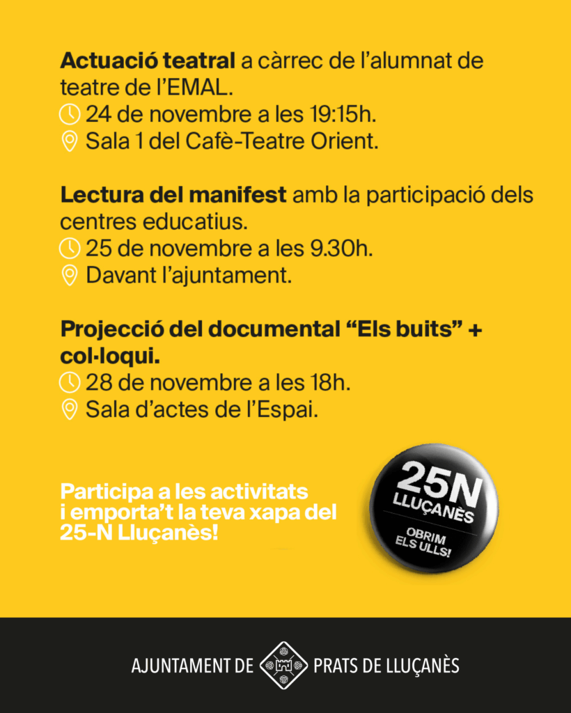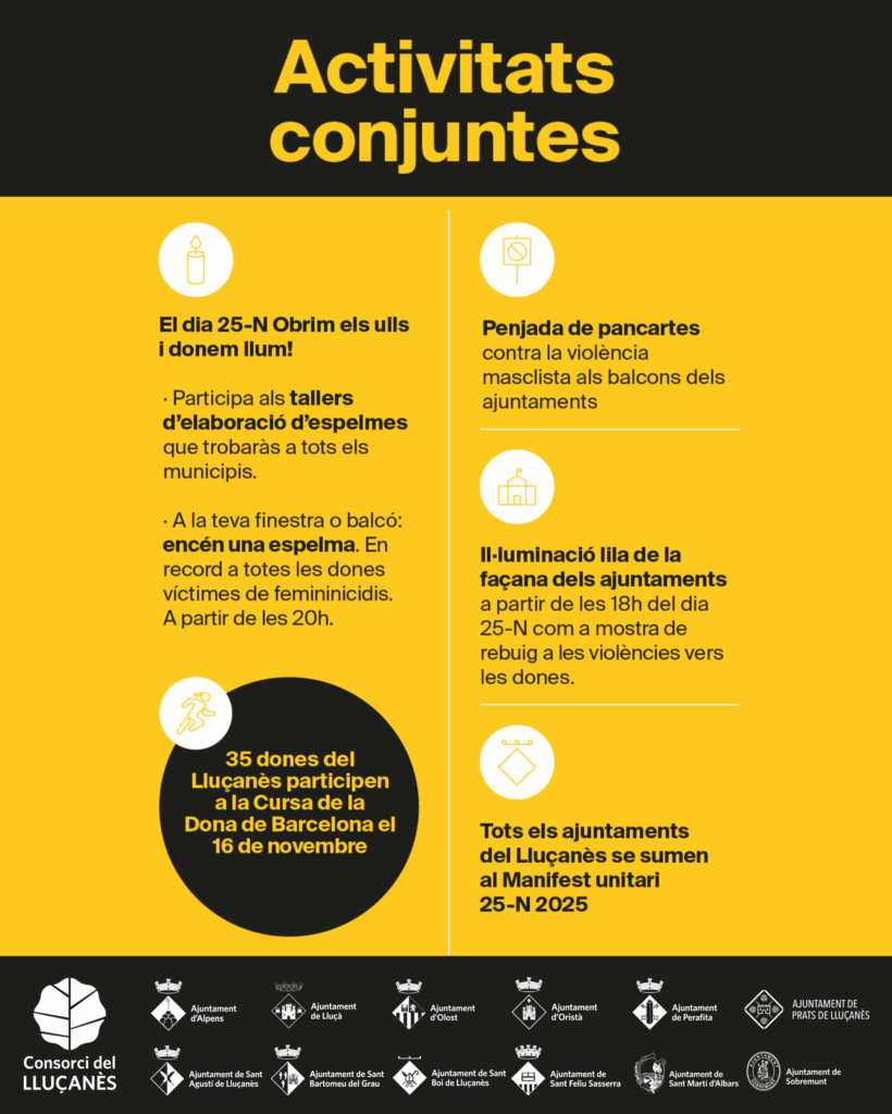 Els actes del 25N s’han impulsat des de l’Àrea d’Igualtat de l’Ajuntament, amb la col·laboració del Consorci del Lluçanès. Les activitats del Dia Internacional per a l’Erradicació de la Violència vers les Dones també s’escampen arreu del territori. Podeu consultar tots els actes de la comarca al web del Consorci del Lluçanès (www.llucanes.cat/25n).